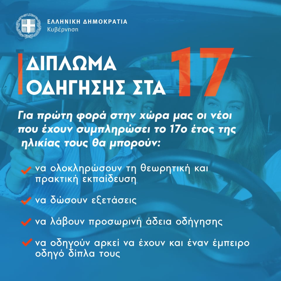 Επίσημα δίπλωμα οδήγησης στα 17 έχουν τη δυνατότητα να αποκτήσουν οι νέες και οι νέοι της χώρας καθώς η κυβέρνηση με μια ακόμη καινοτομία δίνει την ευκαιρία στη συγκεκριμένη ηλιακή ομάδα να βρεθεί στο τιμόνι υπό αυστηρούς βέβαια όρους για την ασφάλειά τους.