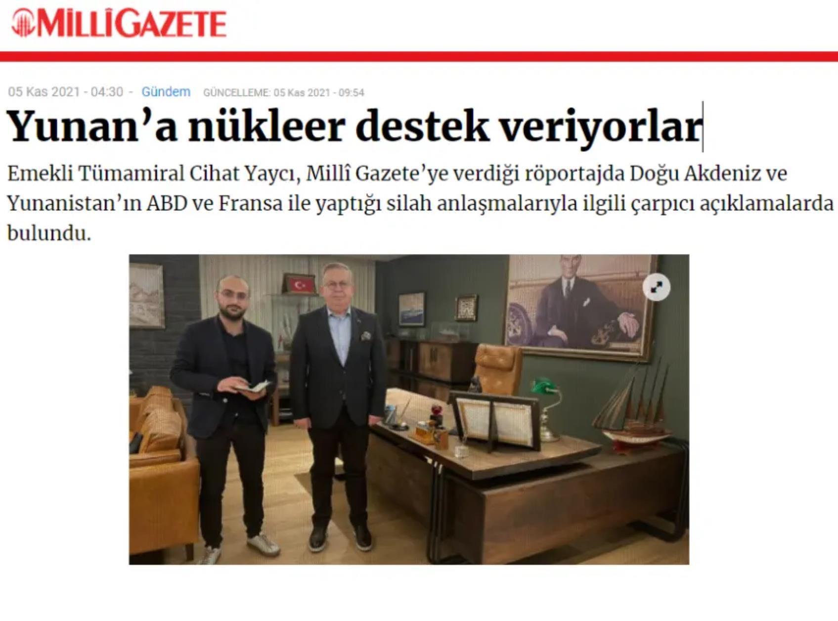 Για «πυρηνική υποστήριξη στην Ελλάδα» εξαιτίας της στρατιωτικής συμμαχίας της με τη Γαλλία, κάνει λόγο νέο προκλητικό δημοσίευμα της τουρκικής εφημερίδας Milli Gazete, το οποίο φιλοξενεί συνέντευξη του θεωρητικού της «Γαλάζιας Πατρίδας», απόστρατου ναυάρχου Τζιχάτ Γιαϊτζί. Όλα όσα αναφέρει ο Θεωρητικός της «Γαλάζιας Πατρίδας» στο εν λόγω δημοσίευμα.
