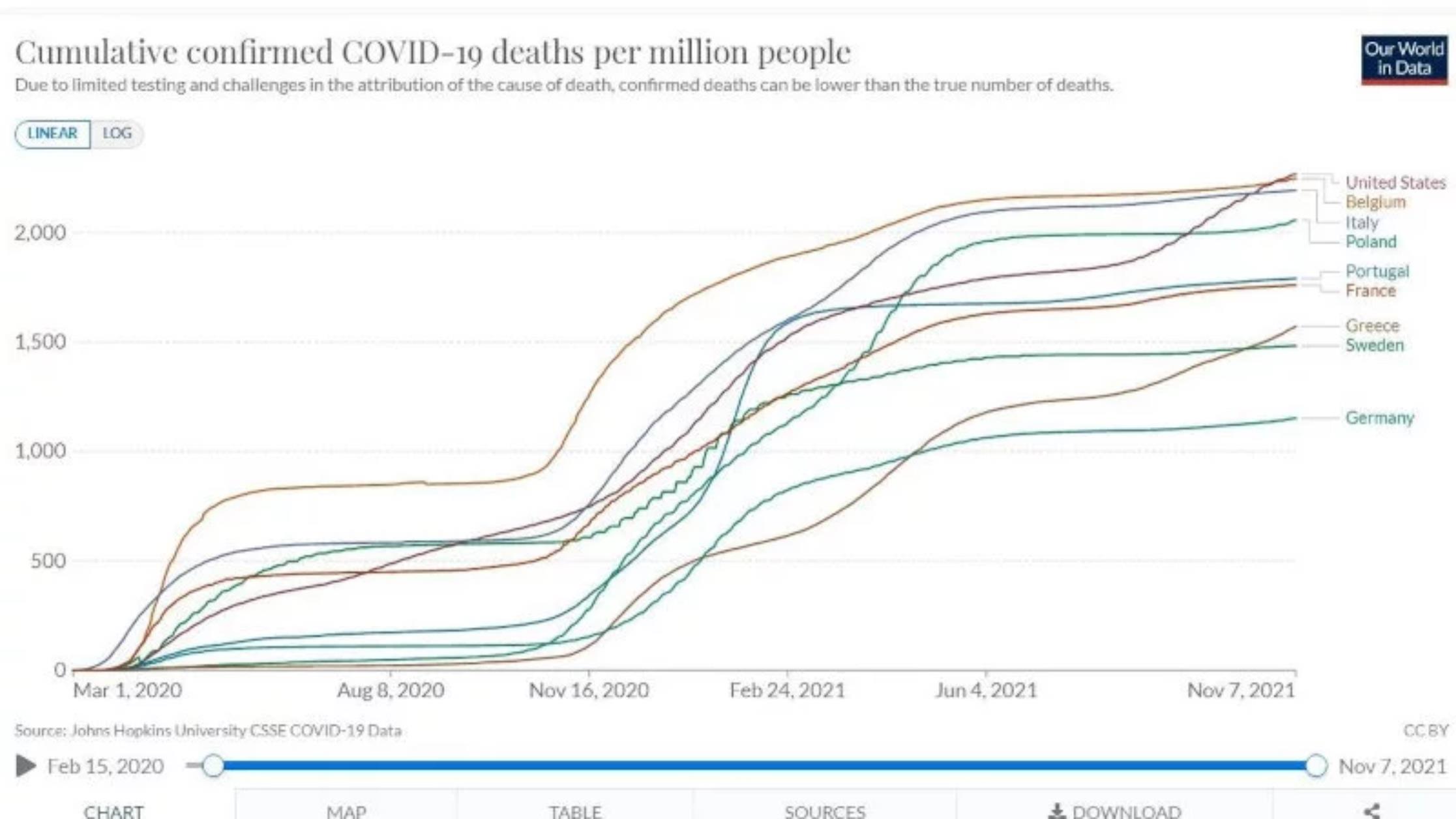 Σύμφωνα με το Our World In Data του Πανεπιστημίου της Οξφόρδης η Σουηδία κατέγραψε σχεδόν 1.500 θανάτους ανά εκατομμύριο πληθυσμού – πολύ λιγότερους σε σύγκριση με τον ευρωπαϊκό μέσο όρο των 1.800 και τους 2.100 της Βρετανίας αλλά και το Βέλγιο και την Ιταλία (που χτυπήθηκε με σφοδρότητα από τον κορωνοϊό στις πρώτες κιόλας ημέρες που o Covid-19 χτύπησε την Ευρώπη) με πάνω από 2.000.