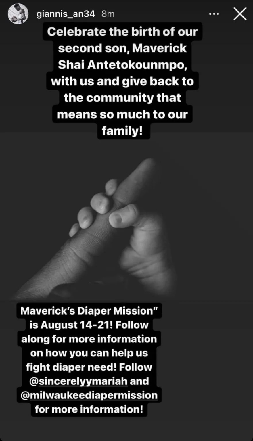 «Γιορτάστε μαζί μας την γέννηση του δεύτερου γιου μας, Μάβερικ Σάι Αντετοκούνμπο και προσφέρετε στην κοινότητα, που σημαίνει τόσα πολλά για την οικογένειά μας. Το Maverick’s Diaper Mission θα γίνει 14-21 Αυγούστου. Ακολουθήστε μας για περισσότερες πληροφορίες σχετικά με το πως θα βοηθήσετε στην καταπολέμηση της ανάγκης για πάνες», έγραψε ο Γιάννης και θέλει να βοηθήσει για άλλη μια φορά με τον τρόπο του την κοινωνία.