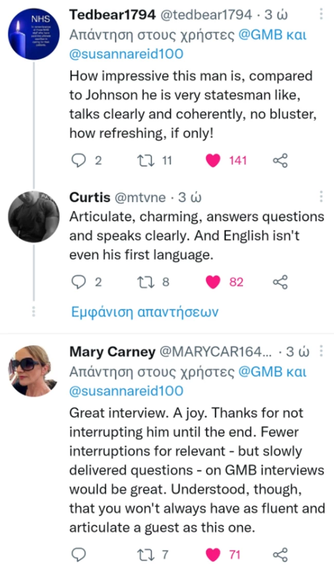 Διαβάστε τα σχόλια των τηλεθεατών στο Ηνωμένο Βασίλειο κάτω από την συνέντευξη του @kmitsotakis μόνον υπερηφάνεια μπορεί να αισθάνεται κάποιος όταν εκπροσωπείται έτσι. Μπράβο Πρόεδρε https://t.co/shfgTFPHNf
