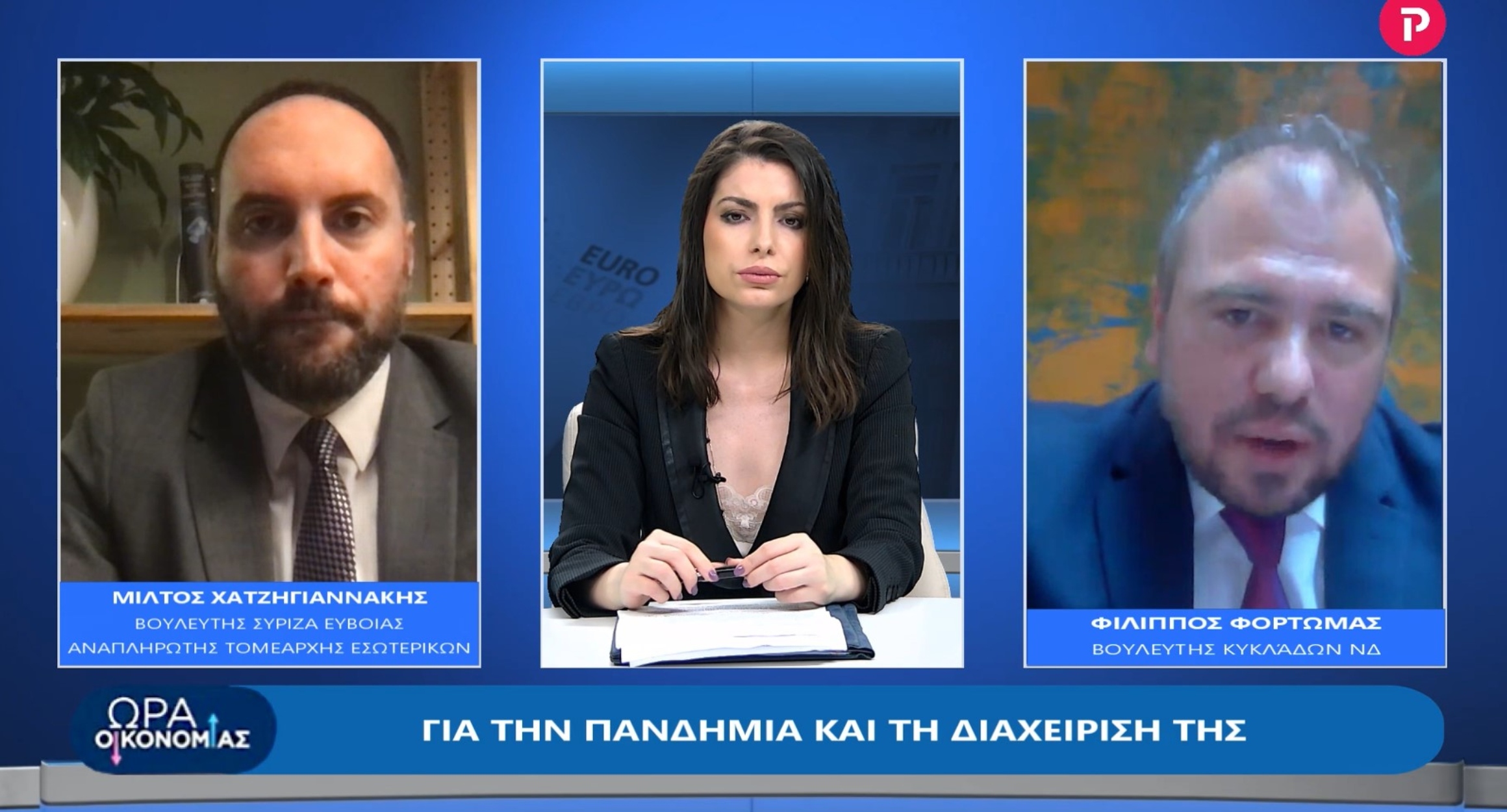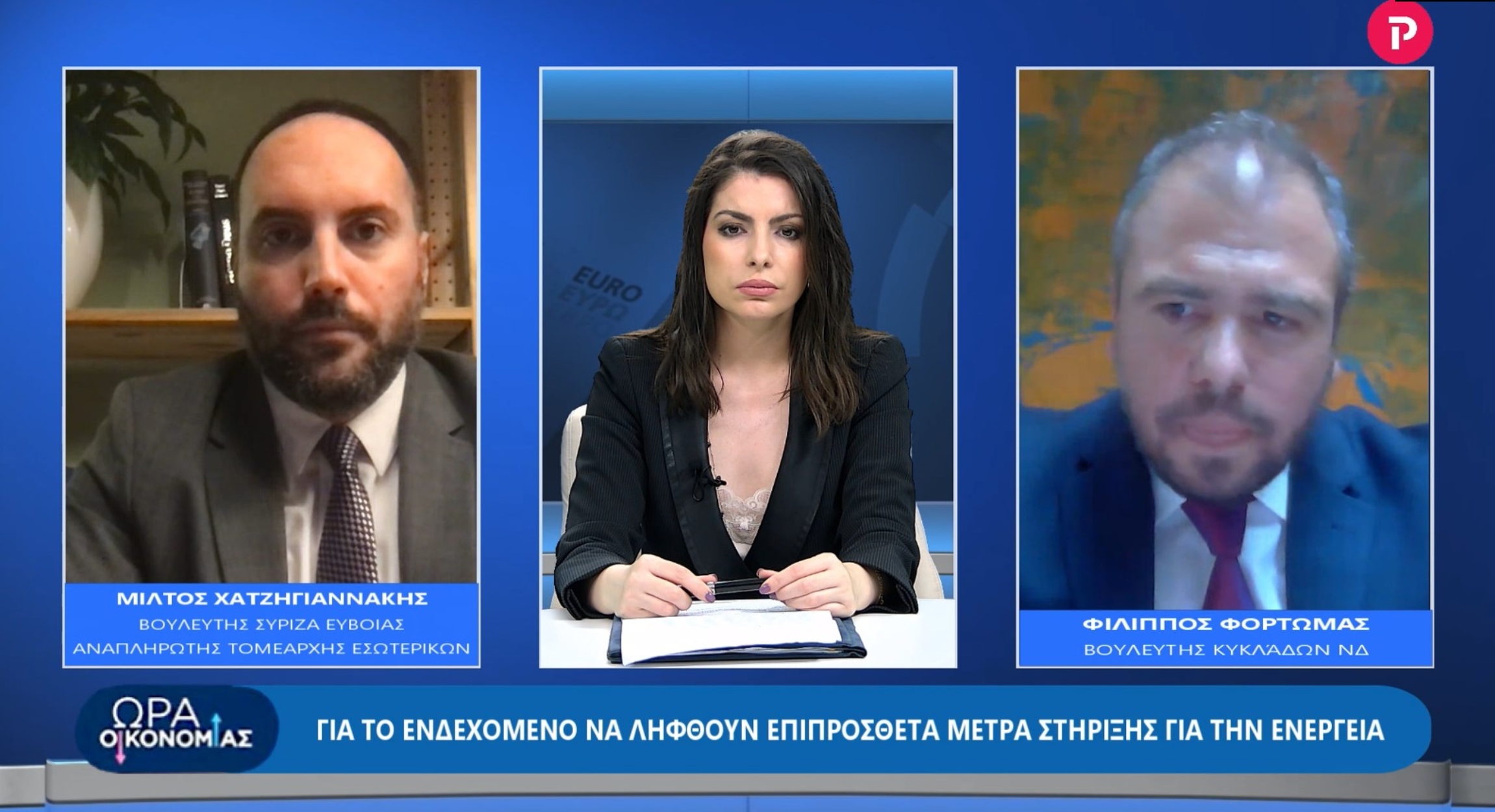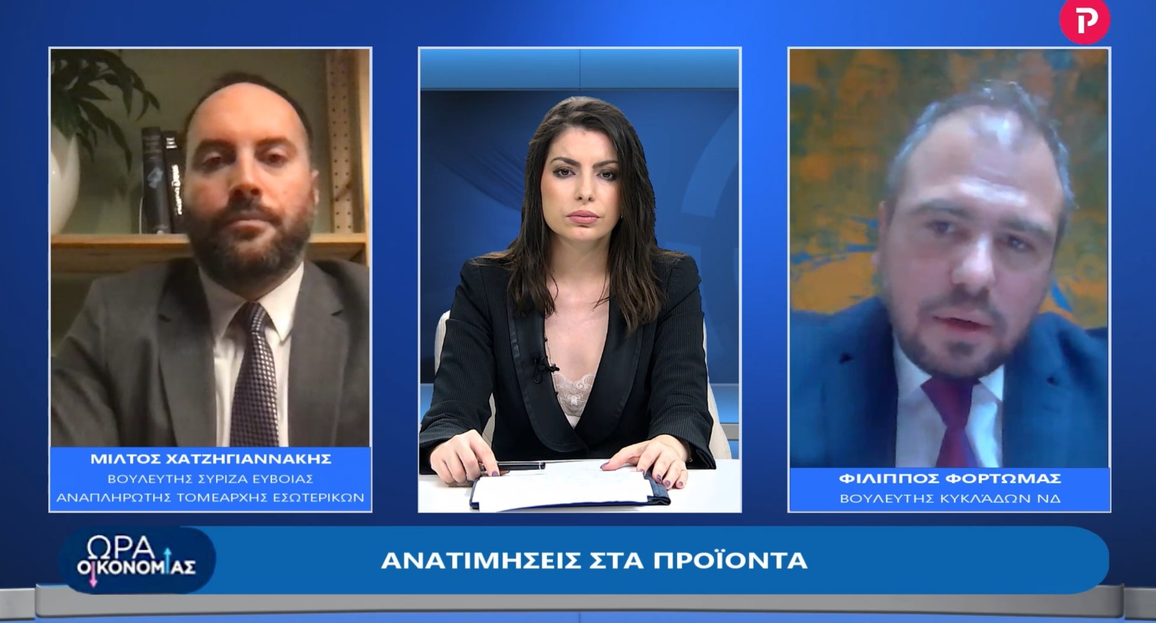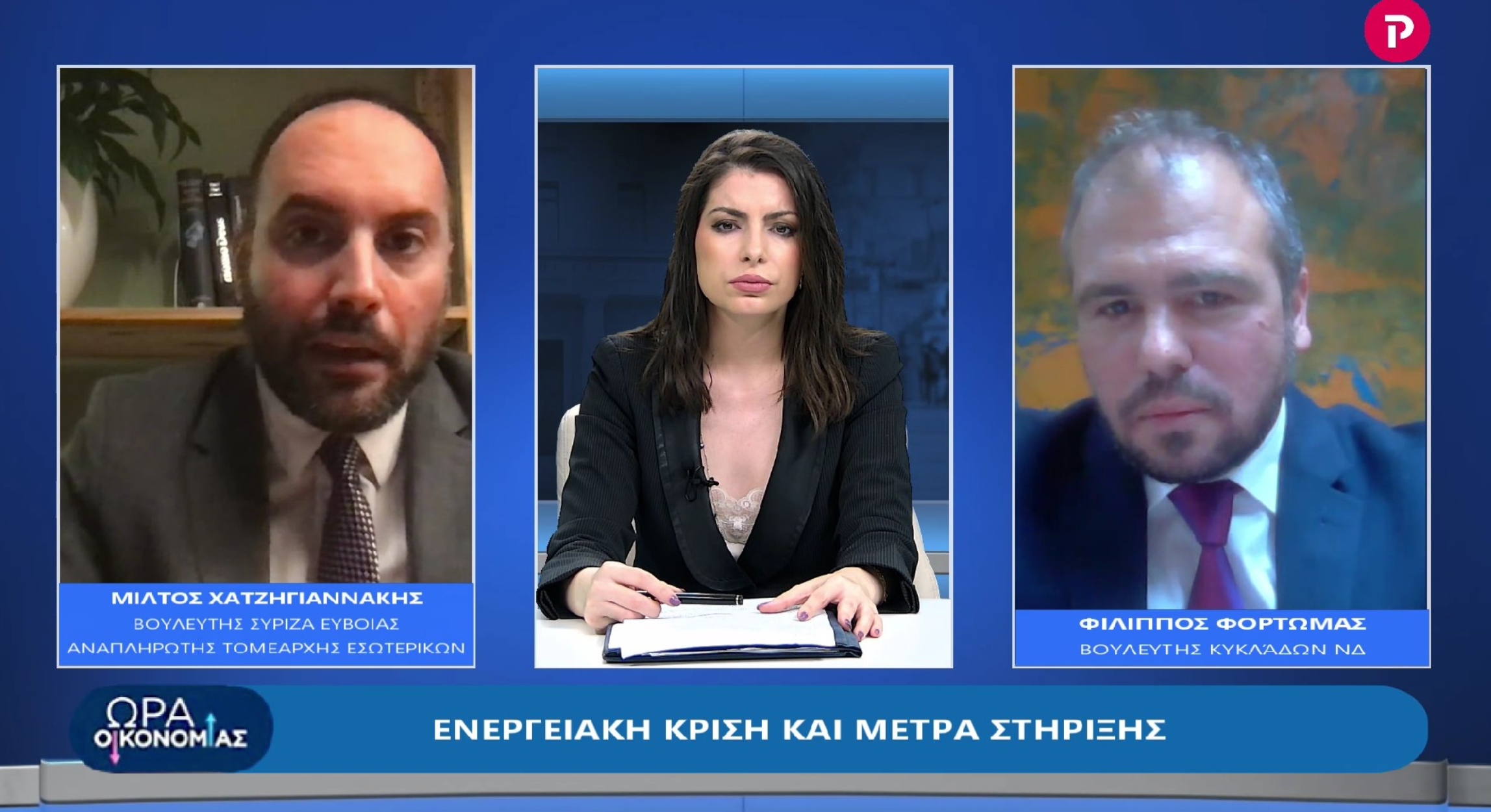 Ο βουλευτής ΣΥΡΙΖΑ Ευβοίας και αναπληρωτής τομεάρχης Εσωτερικών κ. Μίλτος Χατζηγιαννάκης και ο Βουλευτής Κυκλάδων ΝΔ κ. Φίλιππος Φόρτωμας μίλησαν στο pagenews.gr και την εκπομπή “Ώρα Οικονομίας” με τη Σοφία Χύτου, όπου αναφέρθηκαν μεταξύ άλλων στην ενεργειακή κρίση και τα μέτρα στήριξης που έχουν ληφθεί, την ακρίβεια και τις αυξήσεις στις τιμές των προϊόντων καθώς και για την υγειονομική κρίση.